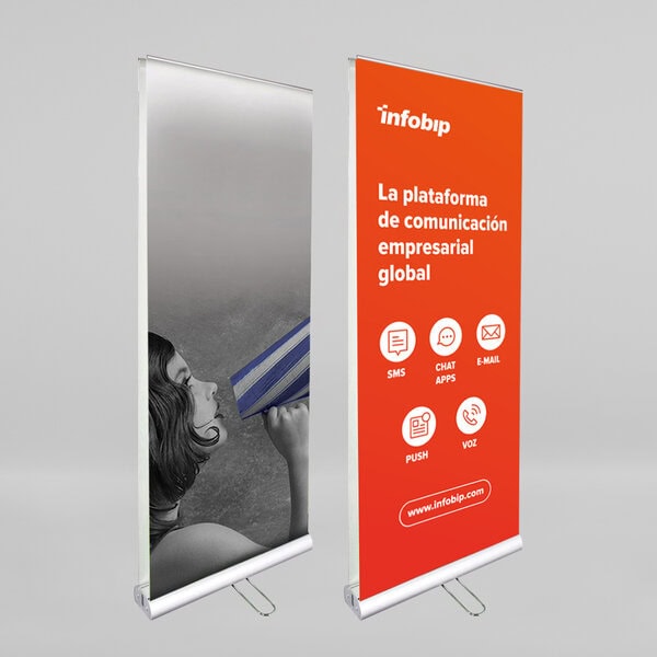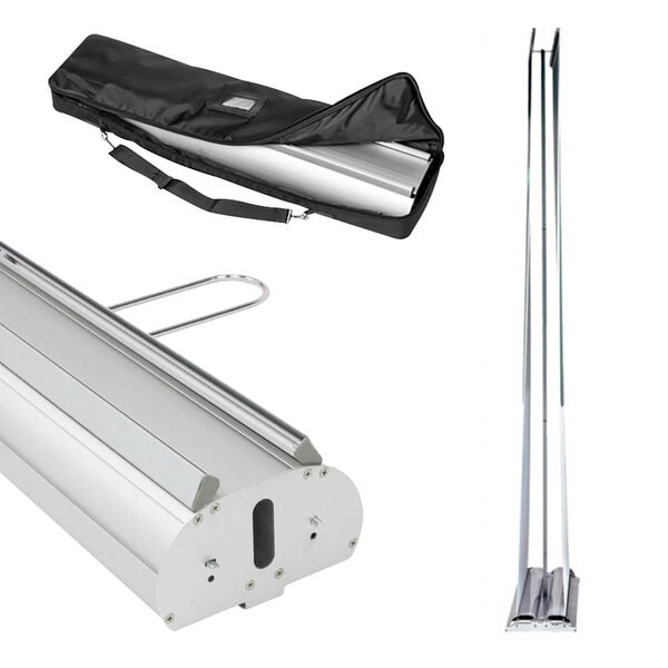 Display con sistema enrollable que permite desplegar el banner a doble cara impreso, cuenta con un sistema de tensión y varilla gruesa posterior, base pesada con laterales cromados visiblemente más elegante. Incluye maletín para fácil transporte.